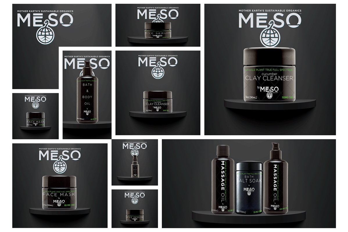 Retail Lines: The "MESO" letters with the sprout could be used for consumer-facing CBD products, perhaps in a gold or different green to signify premium lines.