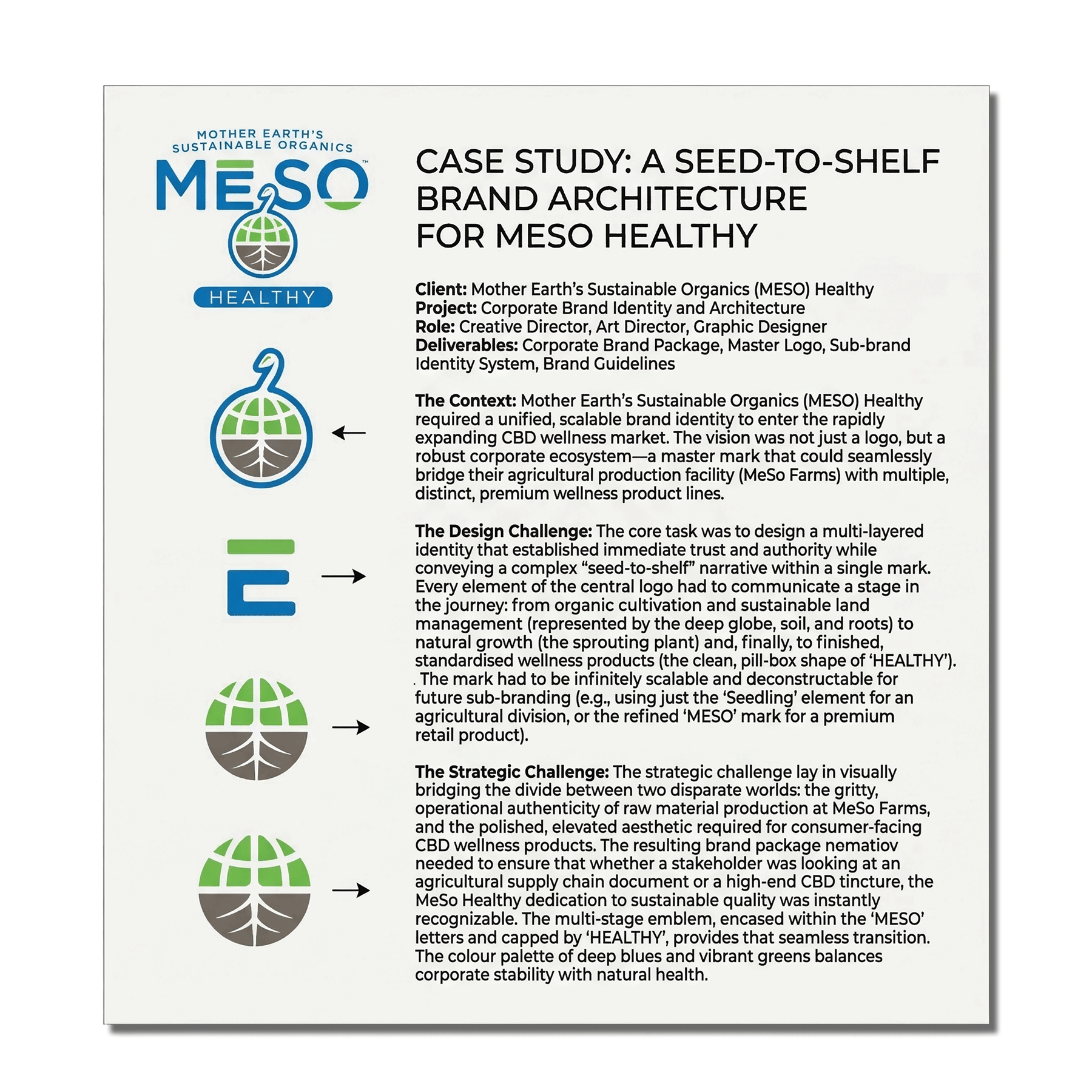 The logo demonstrates exceptional scalability. By breaking it down into its constituent parts (the soil base, the plant sprout, and the combined "MESO" mark), the case study can show exactly how the identity system adapts.