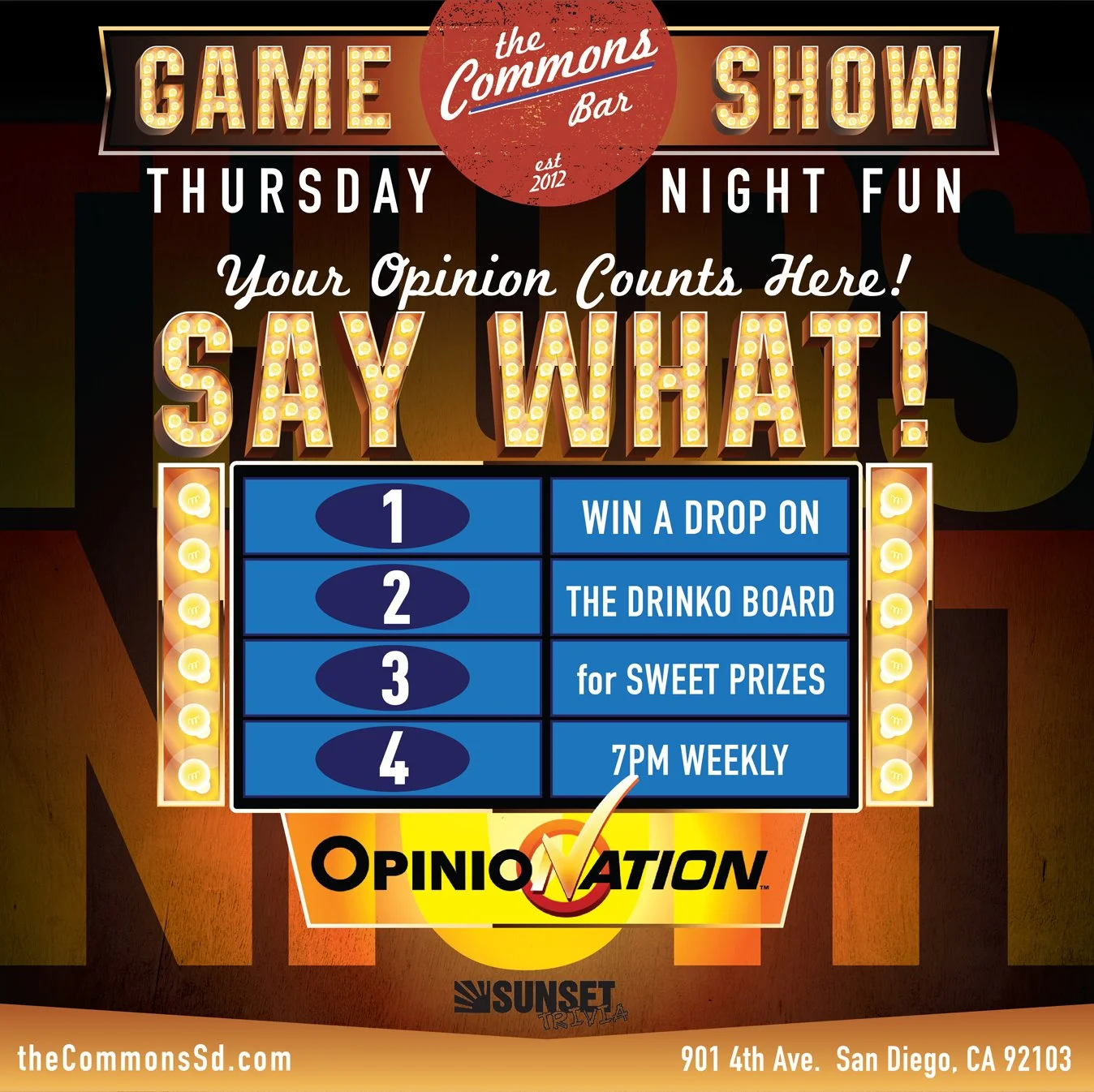 To translate The Commons Bar's high-energy in-house experience into a cohesive digital narrative, we developed a highly structured, rhythm-based social media campaign primarily focused on Instagram, where our engaging brand voice perfectly aligned with the target demographic for maximum reach. We established a unique, stylized visual identity for every night of the week to drive consistent engagement and foot traffic, featuring recurring anchor events like Acoustic Tuesday, Wicked Smart Wednesday (Trivia Night), and Say What Thursday (Game Show Style). This weekly cadence was strategically punctuated with high-impact, custom promotional graphics for major viewing events—including UFC pay-per-views, NFL, and MLB games—as well as massive local cultural moments like San Diego Comic-Con and all major holidays, ensuring the bar remained top-of-mind as the ultimate daily destination.